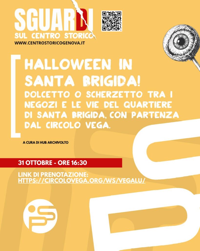 Venerdì 31/10 DOLCETTO O SCHERZETTO dall’Hub Archivolto 🎃 Dolcetto o scherzetto per i negozi e per le vie del quartiere di Santa Brigida con gli operatori del Vegalù! Ecco il programma: 16.30 – 17.00: appuntamento al CIRCOLO VEGA (Salita Famagosta 3R). Solo per i bambini sotto i 3 anni è necessario un accompagnatore. Truccabimbi e letture spaventose 17 .00 – 18.00: dolcetto o scherzetto per i negozi e le vie del quartiere 18.00 – 18.30: orario di uscita dall’HUB Archivolto spazio comune, fuori dalla sede del Circolo Vega ….E SE VI FA PIACERE VENITE TRAVESTITI!! ☂Vi aggiorneremo di eventuali cambi in caso di pioggia
